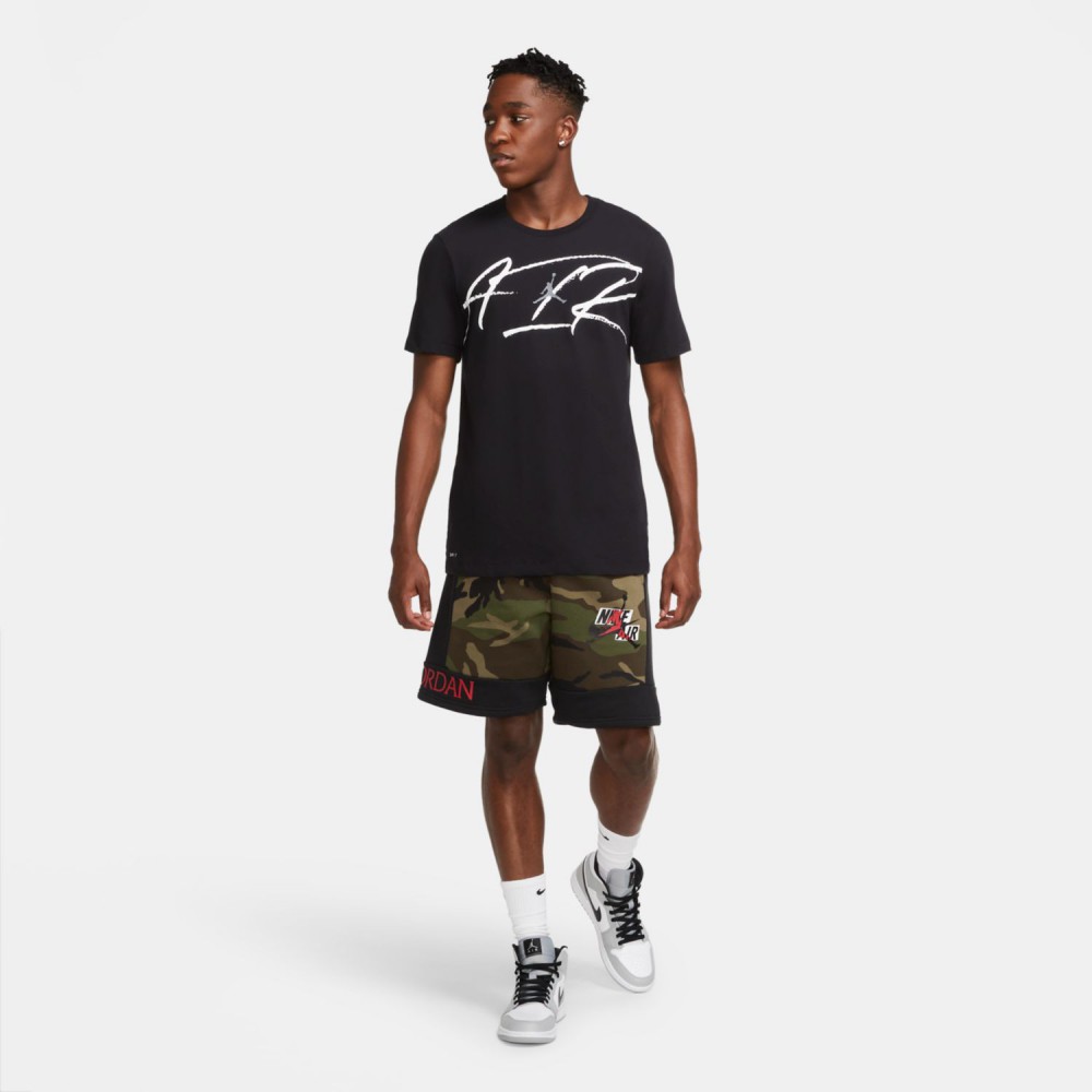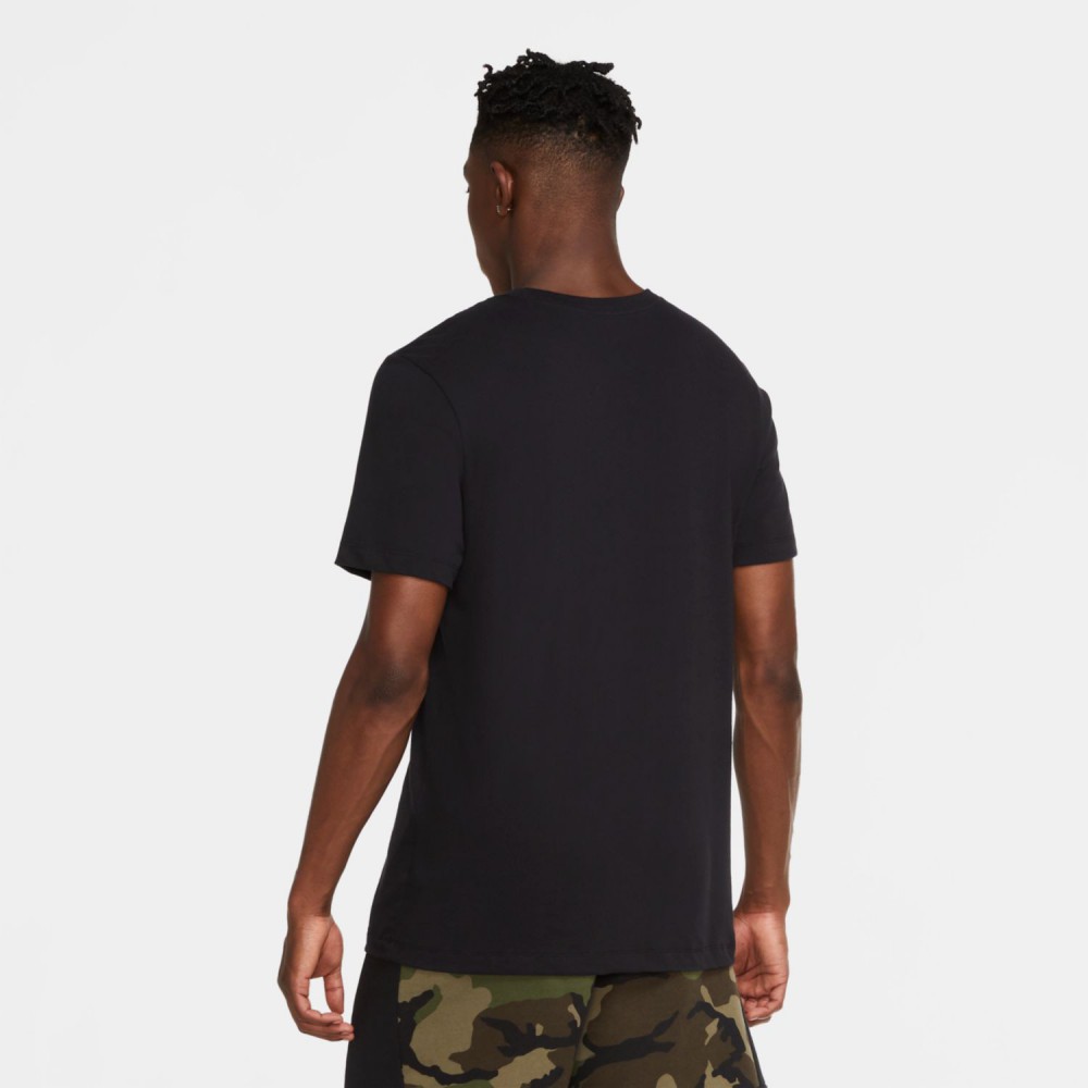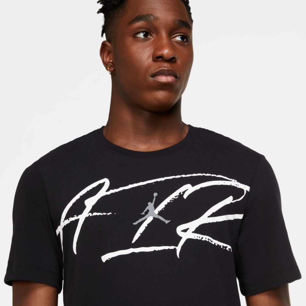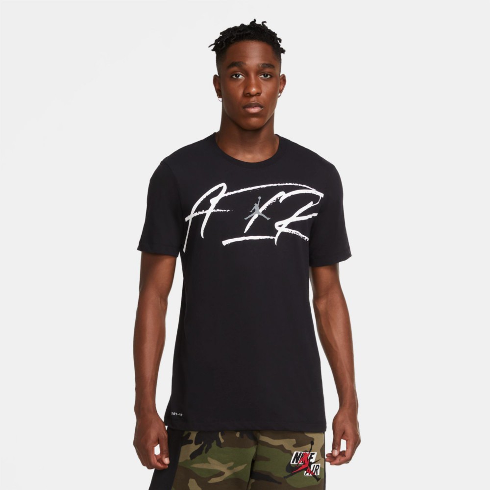 Чёрная мужская футболка из сочетания хлопка и полиэстра от бренда Jordan. Модель с классическим кроем и контрастным принтом с эмблемой Jumpman на груди. Благодаря влагоотводящему материалу футболку удобно носить во время тренировок.