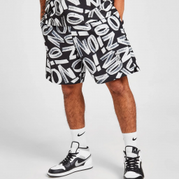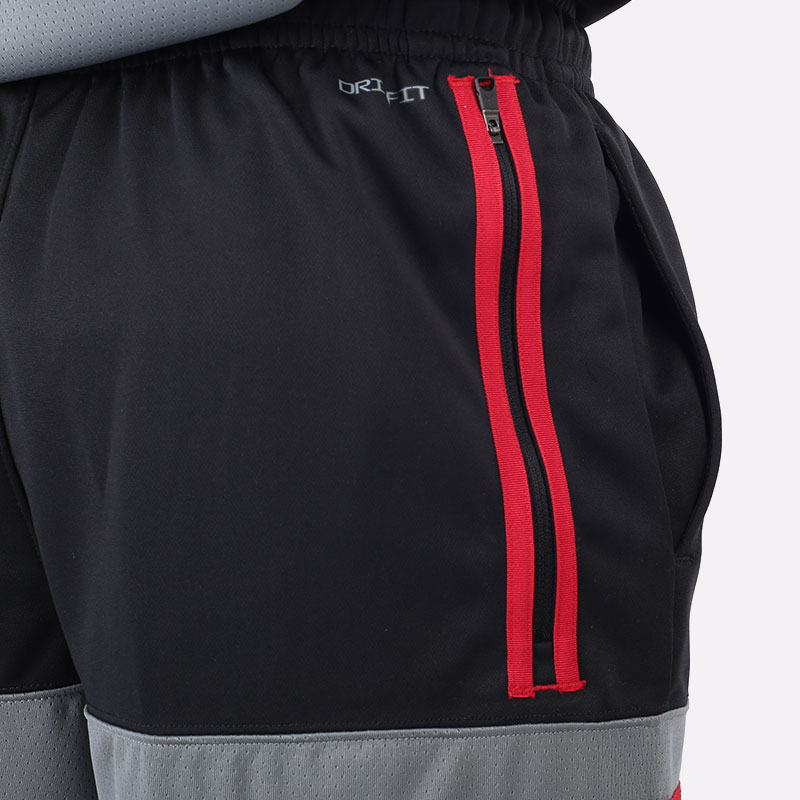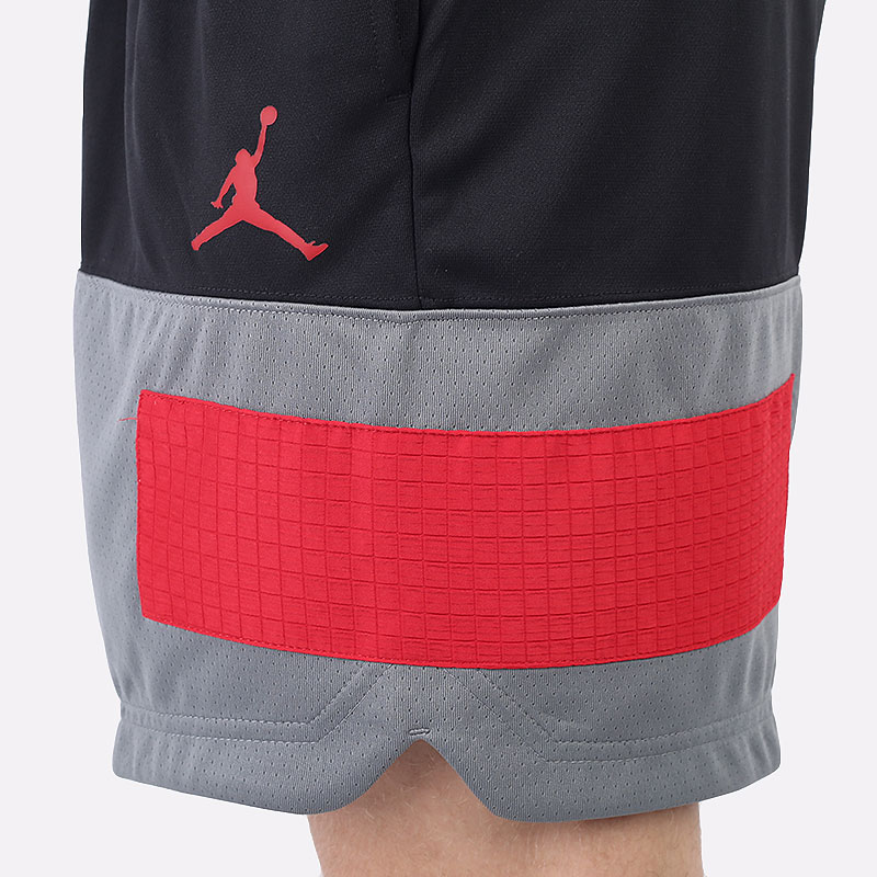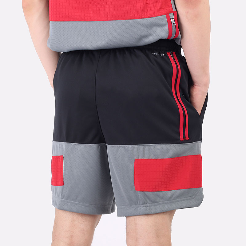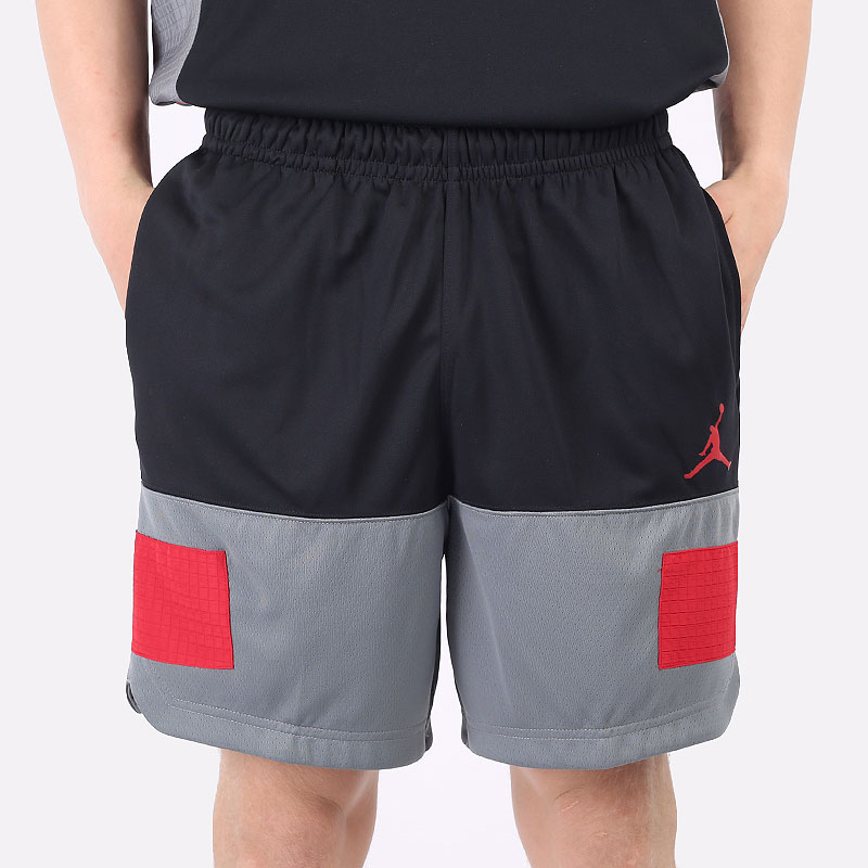 Мужские шорты в тёмной расцветке из влагоотводящего материала от бренда Jordan. Модель из полиэстера с вставкой из перфорированного материала серого цвета снизу и карманом на молнии сзади.
